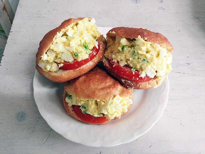 2020.08.30. 감자랑 쓰고 남은 식재료들 넣어서 샌드위치를 만들어 보았다. 중간 발효까지 마친 빵 반죽. 만드는 방법은 건포도 식빵 참고. 반죽을 6등분한다. 둥글 넓적하게 성형해서 팬닝 한다. 2차 발효 끝난 모습. 180도 오븐에 40분 굽는다. 좀 많이 구워진 것 같다. 다음엔 30분만 굽는 걸로... 달걀과 감자를 삶는다. 감자는 껍질 벗겨서 으깨고 달걀은 다지고 양파와 파슬리를 잘게 썰어 준비한다. 마요네즈, 머스터드, 소금, 후추를 넣는다. 섞어주면 감자 달걀 샐러드 완성. 빵을 반으로 자른다. 빵 속에 샐러드를 넣는다. 슬라이스 한 토마토도 넣었다. 이렇게 해서 맛있는 일요일 점심이 완성되었다.
